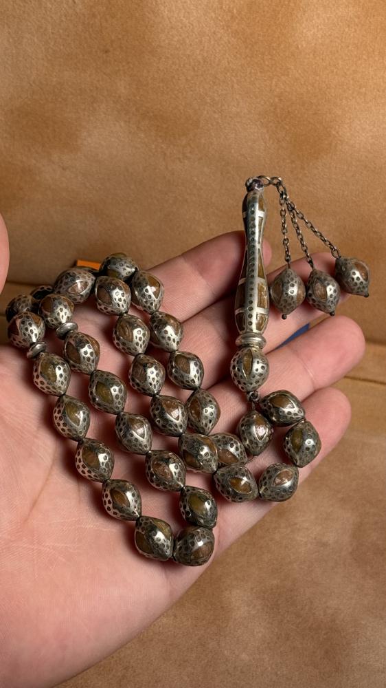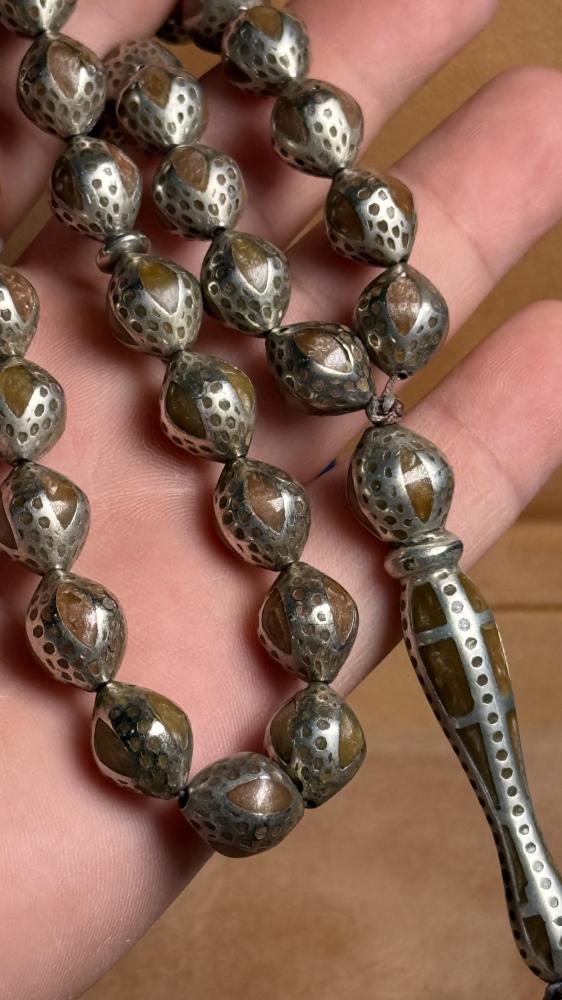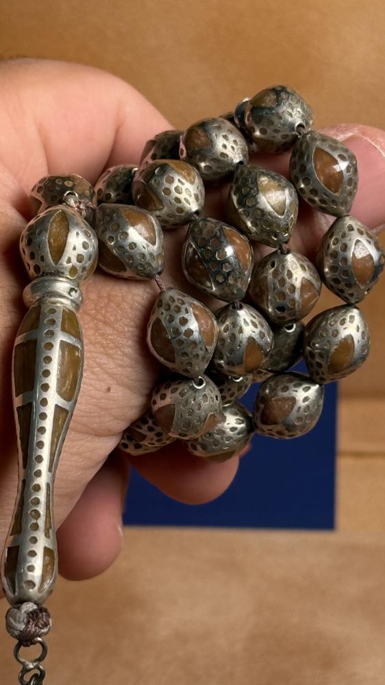 مسباح كوك طبيعي مقفص فضة::عدد الخرز : 33 خرزة ::قياس الخرز : 11 * 14 مل ::الشكة : فضة يدوية مُضاف اليها 3 خرز